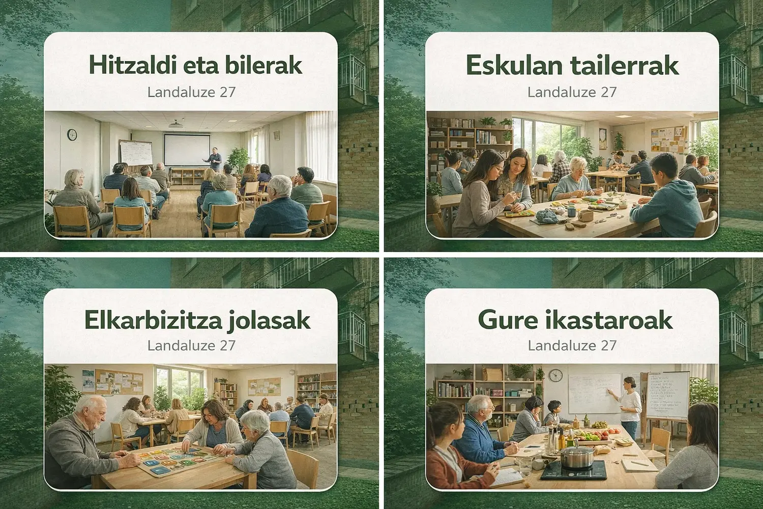 Hitzaldi eta bilerak proposatzen dira, bizikidetza eta ideien trukea sustatzeko. Proposamenak kultur eta jolas-jarduera gisa deskribatzen ditu topaketak, auzokideek elkarrekin hitz egin dezaten, harremanak izan ditzaten eta espazio komunitarioaren esparruan ideiak trukatu ahal izan ditzaten.