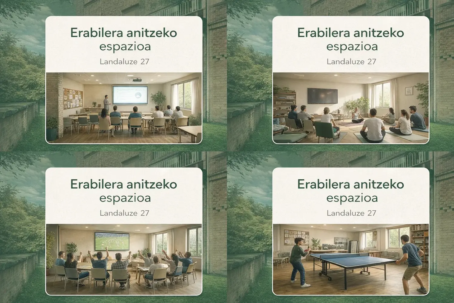 Se plantea un espacio multiusos para actividades culturales, sociales y deportivas: un local adaptable que sirva para distintos usos. La televisión/proyector estaría disponible para actividades específicas, como el visionado de eventos deportivos, pero se propone mantenerla apagada cuando no esté en uso para priorizar la socialización.